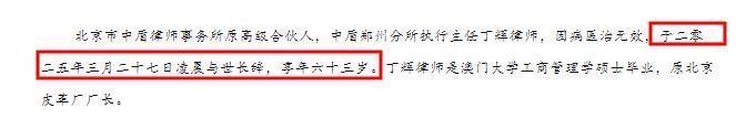 2025年3月27日凌晨,丁辉律师因病去世,享年63岁。